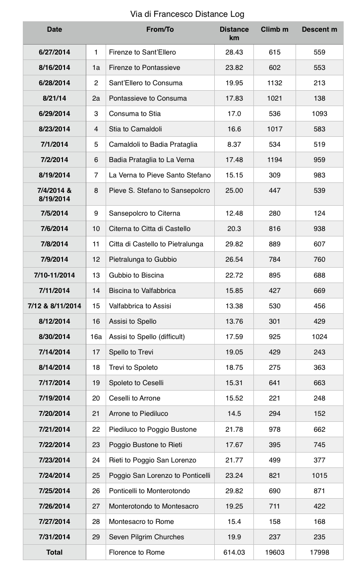 As I’ve said before, my completed book will be the first one that actually guides pilgrims on every step between Florence, Assisi and Rome. The almost-complete guidebooks are Franziskusweg, a German book (in yellow above), along with the German language Outdoor Guide by the Dutchman Kees Roodenburg (not shown). Both of these guidebooks have pilgrims taking a train for the first day out of Florence and then taking public transport the last day or two into Rome. This is too bad, since there are good walking routes at both ends.